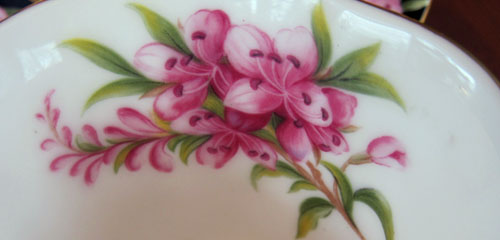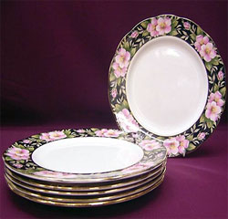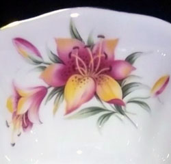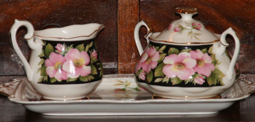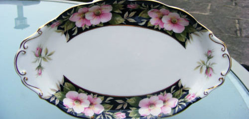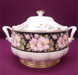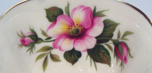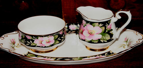 Alberta Rose Alberta's flower is the Wild Rose. It is a flower that is able to grow on mountains and in meadows and the bush produces berries called rose hips. Rose hips can be picked in the late summer and are an excellent source of vitamin C. The wild rose has been the official flower since 1930 Teaset pieces made in this pattern: Oval Serving Platter, Round Handled Cake, Soup Tureen, Coffee Pot, Tea Pot, Fruit Bowl, 6" Bread and Butter Plates, 8" Salad Plates, 10" Dinner Plates, 12" Chargers, Creamer, Open Sugar, Covered Sugar, Regal Tray, Titbit Tray, and Timble