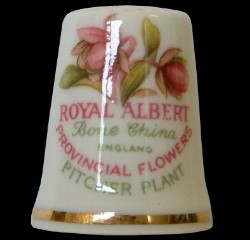 Pitcher Plant Newfoundland and Labrador - Although it was not declared the provincial flower of Newfoundland and Labrador until 1954, this strange plant appeared on the Newfoundland penny during the late 1880s. The pitcher plant is found primarily in bogs and marshland throughout the province. It has a large wine-red flower with a red and gold centre, and hollow pitcher-shaped leaves are attached to the base of the stem. An insectivorous plant, it feeds off the insects that become trapped inside when the leaves fill with water. |